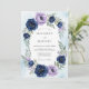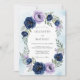 This design features a lush arrangement of navy blue and lavender peonies alongside soft purple roses. Delicate sage green foliage and a light slate blue watercolor wash create a serene, elegant atmosphere. The botanical elements are rendered in a romantic, painterly style, perfect for a sophisticated seasonal event.