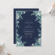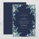 A deep navy blue backdrop sets a moody tone for this sophisticated design, featuring ethereal watercolor botanicals. Delicate teal and sage green wildflowers, alongside airy foliage and soft blossoms, create a natural forest aesthetic. This elegant palette captures a serene, painterly atmosphere for an evening or seasonal winter event.