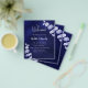 A modern, elegant, wedding program, timeline. A navy blue background, decorated with eucalyptus, sprigs. The blue colour is uneven. Personalise and add your names and wedding details. If you have more text it's possible to reduce the line space. You can also add text on the back.