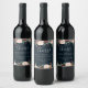 Elegant navy blue, burgundy red and blush pink watercolor floral frame, personalised bottle label. Labels feature navy blue colour background and multiple template text lines for message, names and date.
