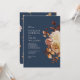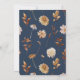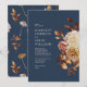 Navy Blue Fall Floral Wedding Invitation with pattern on the back. This elegant and rustic wedding invitation features hand-painted watercolor burnt orange and terracotta leaves, cream and beige dahlias, and beautiful rust-coloured roses on a navy blue background.