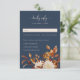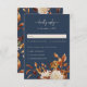 Elevate your wedding stationery with the Navy Blue Fall Leaves Response Card featuring an elegant script from the "Fall Navy Blue Terracotta Floral and Leaves Wedding Invitation Collection." Immerse your guests in the stunning elegance of hand-painted watercolor burnt orange and terracotta leaves, cream and beige dahlias, and stunning copper and rust-coloured roses on a navy background. This RSVP card captures the essence of an autumn wedding, ensuring a cohesive and unforgettable experience. Thoughtfully designed to complement coordinating invitations, enclosure cards, and welcome signs, this RSVP card adds a touch of sophistication to your wedding.