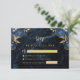 This elegant wedding RSVP enclosure card features blue floral bouquets set off with gold faux foil greenery in two corners, on a background image of navy blue watercolor agate. The customizable text combines pale gold-colored serif and handwriting fonts. The reverse side features a matching navy blue and gold floral and agate design.