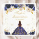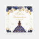 This elegant and glamourous Quinceañera napkin features a beautiful princess with dark hair in a tiara and navy blue ball gown. The text combines handwritten script and modern sans serif fonts for a classy and sophisticated look. The floral arrangements and gold confetti create the perfect blend of rustic and chic.