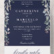All in one wedding invitation featuring a beautiful floral greenery cascade, pretty string lights, elegant typography, and monogram initials on a navy blue background. The invitation includes a perforated RSVP card with your wedding website QR code and details. Designed by Thisisnotme©