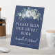 Bold navy blue and white peony floral evening Please Sign Our Guest Book pedestal sign for a modern winter wedding. An elegant botanical spray of green leaves unfolds above trendy handwritten white script for a gorgeous modern event sign for your guestbook.