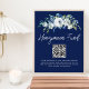 Bold navy blue and white peony floral evening Honeymoon Fund poster with a QR code for a modern winter wedding. An elegant botanical spray of green leaves unfolds above trendy handwritten white script for a gorgeous modern event sign for your event.