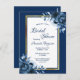 On front: A navy blue background with a faux simple gold and white frame. Decorated with blue flowers, roses. Templates for the bride to be's name and party details. The name and text: Bridal Shower are written with a hand lettered style script, blue coloured letters.