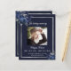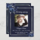 An elegant 2-page program. A dark blue background, a faux silver frame, blue florals and space for a photo. Personalise and add name, dates and your text.