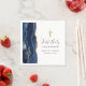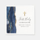 The left-hand edge of this elegant napkin features a navy blue watercolor agate border trimmed with faux gold glitter. A faux gold foil cross appears above the customisable text, which combines handwriting, copperplate and italic fonts in charcoal grey on a white background. Personalise it with the name of the guest of honour and the date.