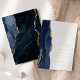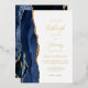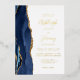 The left-hand edge of this elegant modern wedding invitation features a navy blue watercolor agate border trimmed with faux gold glitter. The customisable text combines handwriting, copperplate and italic fonts in real gold foil on a white background. The reverse side features a matching navy blue and gold agate design.