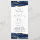 This elegant, modern wedding program features navy blue watercolor agate top and bottom borders trimmed with gold faux glitter. The text appears in elegant charcoal grey handwriting and copperplate fonts on a white background.