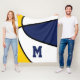 This team colours fleece blanket for a basketball player or fan features the image of a simple, abstractly oversized basketball that has alternating navy blue, gold & white panels - personalise with the athlete's monogram or team varsity letter - by katz_d_zynes