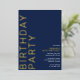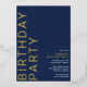 Modern, minimal style birthday invitations with gold accents on a dark blue background. "BIRTHDAY PARTY" text and "[name's] birthday" text will be printed in real metallic foil; while the event details text will be printed in matte white, for easy readability.