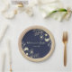 Elevate your wedding reception with these elegant navy blue paper plates, adorned with delicate gold floral illustrations and romantic calligraphy. Personalised with your names and wedding date, this design blends timeless sophistication with modern styling. Perfect for navy and gold wedding themes, evening receptions, or formal gatherings. A beautiful and practical detail for your dessert table, cocktail hour, or rehearsal dinner.