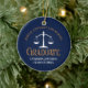 This chic navy blue and gold custom law school graduation Christmas ornament features classy typography for a class of 2025 graduate and their professional photo. Customize with your graduating year under the white scales of justice for a great personalized lawyer or attorney photograph gift.