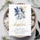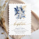 Modern and Elegant Baptism Invitation. This beautifully designed invitation features the word "Baptism" in handwritten gold lettering. The design is adorned with exquisite watercolor navy blue and gold flowers, complemented by a delicate gold and blue cross, all set against a pristine white background. Personalise the invitation further with your celebration details and photo on the back to create a truly unique and memorable keepsake.