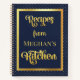 Modern, navy blue recipe notebook has a gold polka dot edge, then a gold foil stripe going around a solid navy blue background. The words Recipes and Kitchen are done in gold foil as well. Personalise it by using the "personalise this template" link.