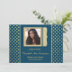 An elegant photo announcement or invitation for the graduate with gold polka dot pattern on navy blue background and modern frame with gold "graduate" lettering. Just upload your own image and customise the text for your special graduate. Can be customised for a party or open house invitation by adding the event details to the back or used as a photo announcement.