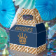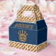Elegant favour box featuring a beautiful gold crown and vibrant typography on a blue and faux gold stripes pattern background.