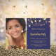 On front: Add your own vertical size photo of the graduate. A chic navy blue background colour, decorated with faux gold stars. Personalise and add a name and party details. Golden letters.