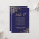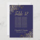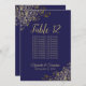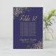 These beautiful large sized table number cards feature a simple yet elegant design with gold script calligraphy on a navy blue background with a frilly golden faux foil floral filigree in the corners. Each card has room for the names of 10 guests so they also function as a seating chart making it easy for people to find their tables at your wedding reception.