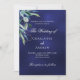 A modern, stylish invitation for a wedding. A navy blue background, decorated with greenery. The blue colour is uneven. Personalise and add your names and details.