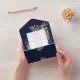 All-in-one wedding invitation featuring elegant botanical watercolor greenery leaves on a navy blue background and a chic gold frame border. The invitation includes a perforated RSVP card featuring a QR code. Designed by Thisisnotme©