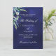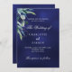 A modern, stylish invitation for a wedding. A navy blue background, decorated with greenery. The blue colour is uneven. Personalise and add your names and details.