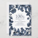 Navy blue/indigo leaves and floral on white 100th birthday party invitation. Contact us for help with customisation or matching products.