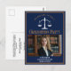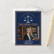 This chic navy blue and gold custom law school graduation party postcard invitation features classy typography for a class of 2024 graduate above your student photo. Customise with your graduating year under the white scales of justice and photograph for a great personalised lawyer or attorney invite.