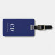 Navy blue faux leather print as background. Personalise and add your monogram letters and full name on the front. Your contact information on the back. White text.