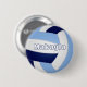 This volleyball themed birthday party pinback button is fully customisable and features the realistic image of a volleyball that has light blue, navy blue and white panels - athlete's name can be personalised - by katz_d_zynes