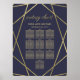 This modern and elegant wedding seating chart features a trendy faux gold geometric shape and fancy calligraphy on a navy blue background. Easily delete any tables you do not need for your wedding guests.