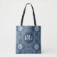 A stylish floral blue mandala pattern with Navy Blue. featuring modern navy blue, stylish typography, with a monogram monogrammed, trendy initials, an elegant sophisticated classy chic, with a circle pattern illustration, a create your own, with a simple minimalist, minimal, reusable tote