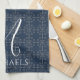This design features a navy blue kitchen towel, perfect for holiday baking, a monogram script, a hostess keepsake, a handwritten initial, a cute simple, elegant rustic, festive snowflake design, with a monogrammed letter, minimalist design.