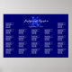 Navy blue, monogrammed wedding reception seating chart poster is 24 x 36 inches. Dark blue background with white text and bright blue initial. Seat guests by last name initial or by table number / name. Delete any unneeded sections.