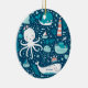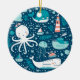 Add a custom nautical touch to your holiday tree with this adorable ocean Christmas ornament. Ceramic ornament has a whale, octopus, sailboat, jellyfish, and lighthouse on a navy blue background. Ornament may be personalised with the first name of your kid on the front and the year and a photo on the back.