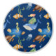 Under the sea theme. A navy blue background, and a pattern with whales, turtles and fish