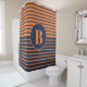Navy blue and orange horizontal-striped shower curtain monogrammed with your initial.