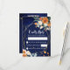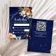 Orange and white roses sage eucalyptus greenery navy blue background gold geometrical frame floral wedding RSVP card QR RSVP code at the back - if not needed - just delete those fields from text box.