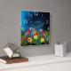 Tropical birds, parrots in blue, yellow and red sitting on green palm leaves. Decorated with tropical flowers. A dark blue sky as background. The blue color is uneven. Template for a the name of your house, beach house, vacation home or your family name. White hand lettered style script. Clock numbers from 9 to 3.