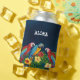 Perfect for hot, warm tropical days and nights! On the beach or for a summer party. Tropical birds, parrots in blue, yellow and red sitting on green palm leaves. Decorated with tropical flowers. A dark blue sky as background. The blue background colour is uneven. White large letters and the text: Aloha.