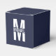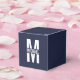 featuring personalised monogram in white bold modern sans serif font style with box of name in the middle of monogram on navy blue background.