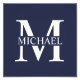 featuring personalised white monogram in classic serif font style with box of name in the middle of monogram on navy blue background.