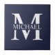 featuring personalised white monogram in classic serif font style with box of name in the middle of monogram on navy blue background.