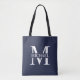 featuring personalised white monogram in classic serif font style with box of name in the middle of monogram on navy blue background.