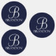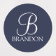 features personalised monogram in white classic script font style and name in white classic serif font style on navy blue background.