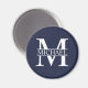featuring personalized white monogram in classic serif font style with box of name in the middle of monogram on navy blue background.