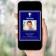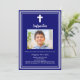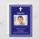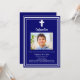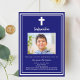 A navy blue blue background, decorated with a white frame, and a white cross Personalise and add a photo name and details. White text.